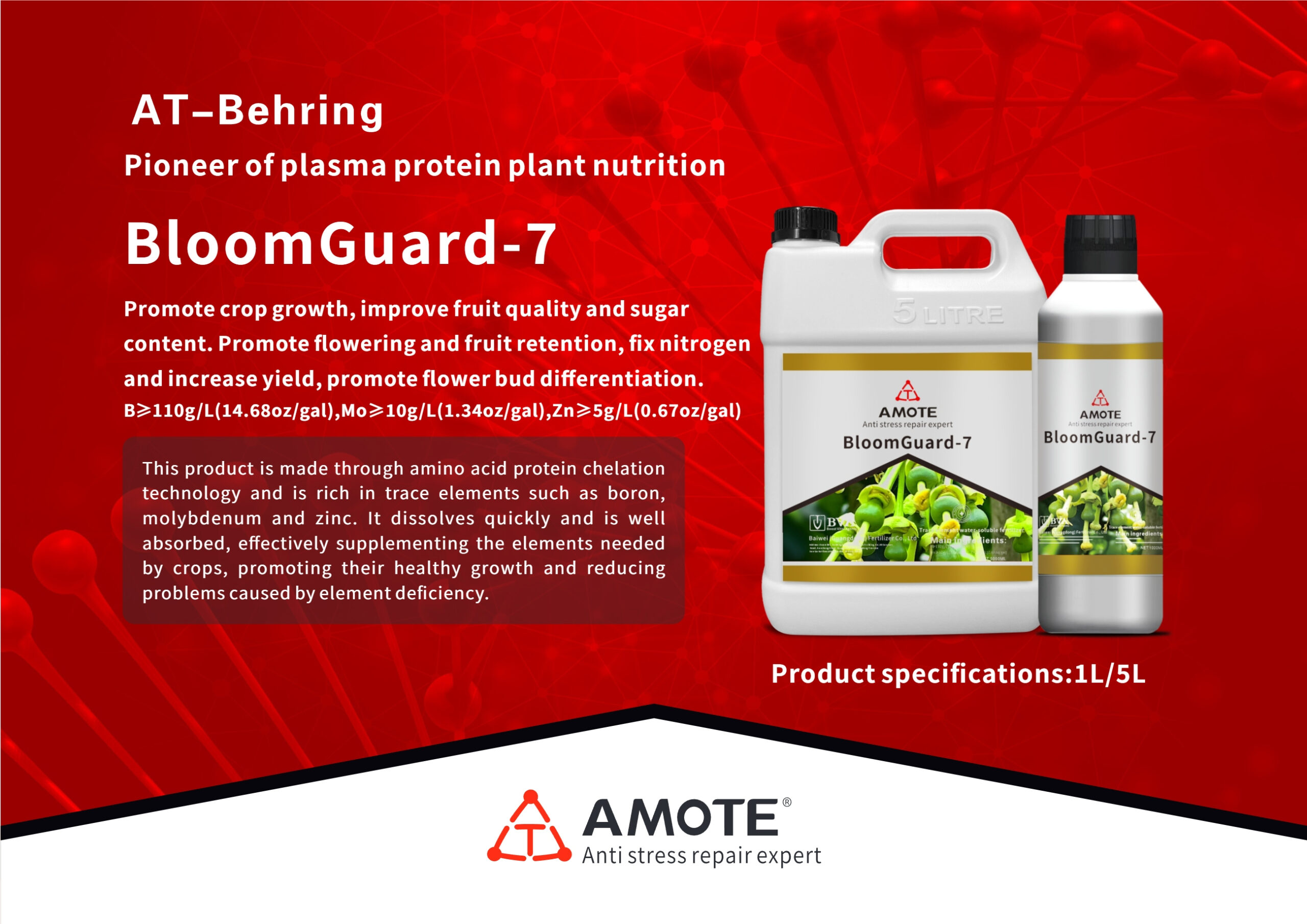 This product is made through amino acid protein chelationtechnology and is rich in trace elements such as boron,molybdenum and zinc. lt dissolves quickly and is wellabsorbed, effectively supplementing the elements neededby crops, promoting their healthy growth and reducingproblems caused byelement deficiency.
